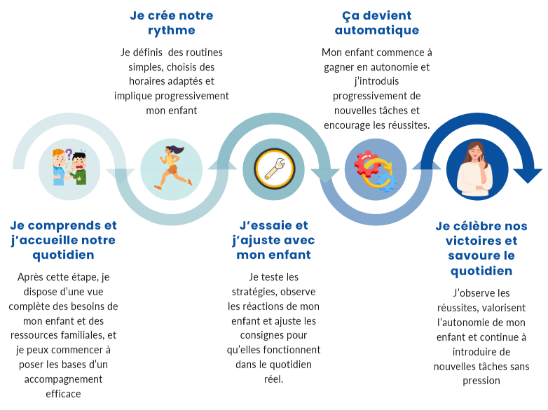 Le Sentier de l'autonomie guide les parents d’enfants de 3 à 10 ans à passer du stress quotidien et de l’impression de tout devoir gérer à une autonomie renforcée de l’enfant et à une vie familiale plus sereine. Un parcours pensé pour apaiser vos journées, renforcer l’autonomie de votre enfant et vous permettre de souffler à nouveau.